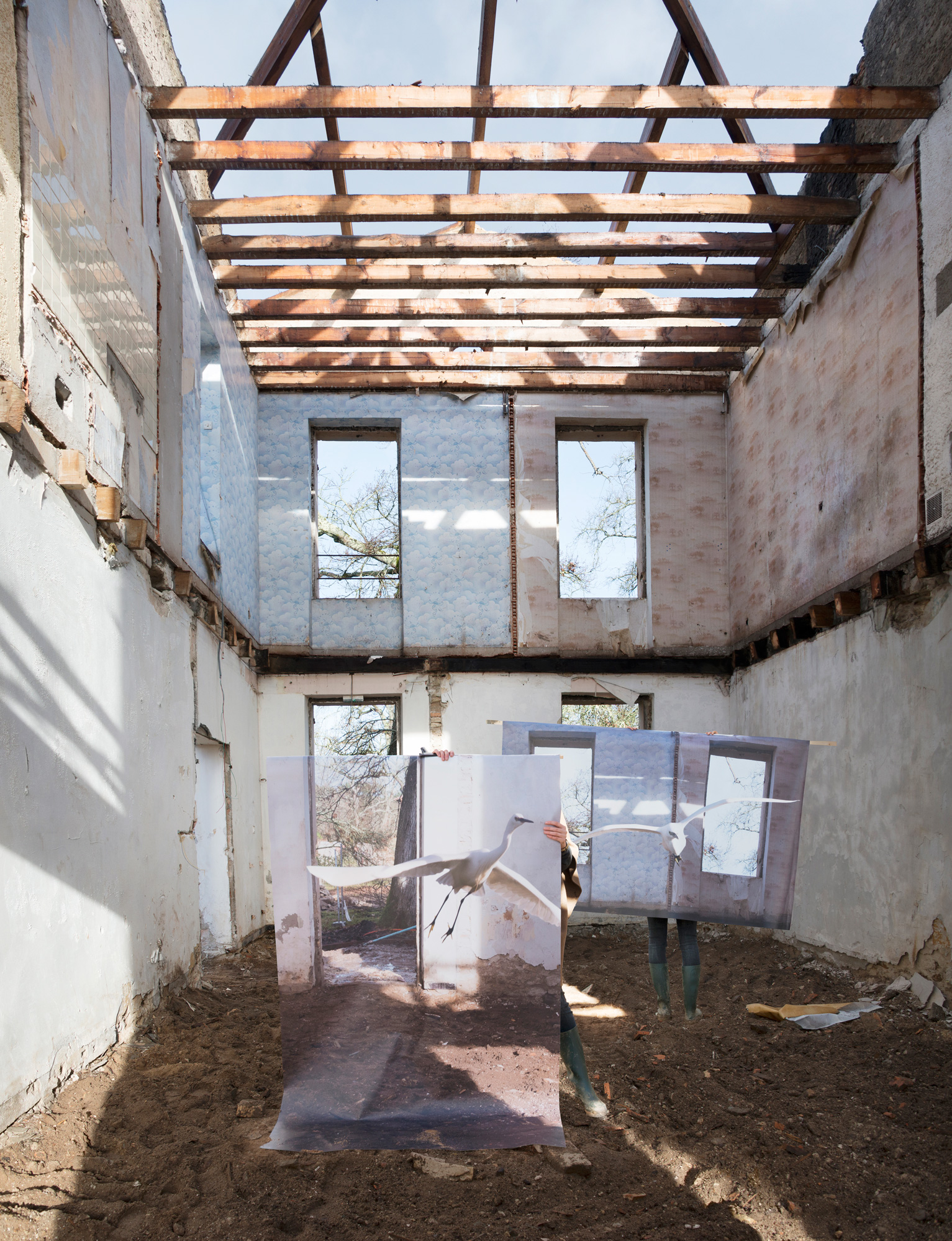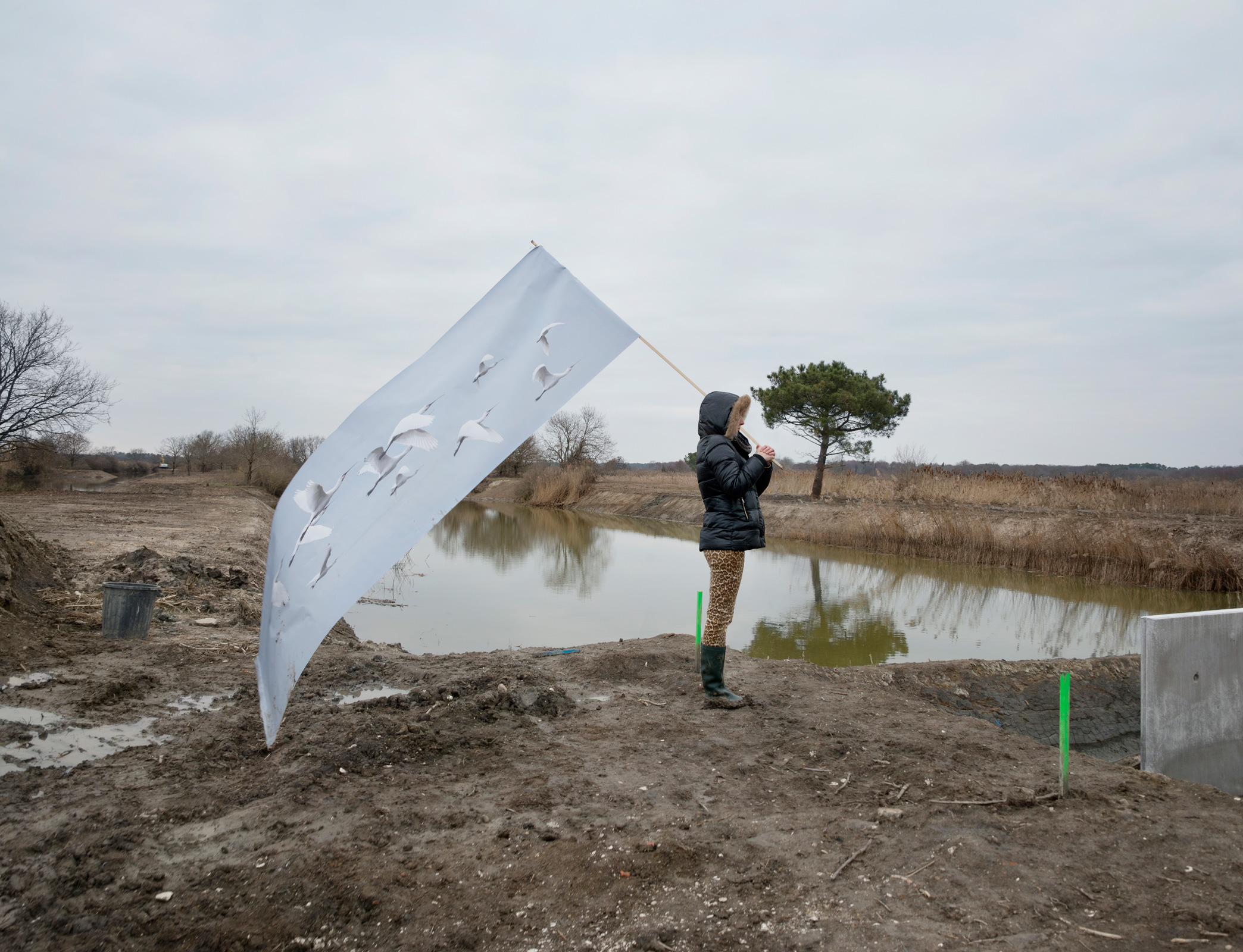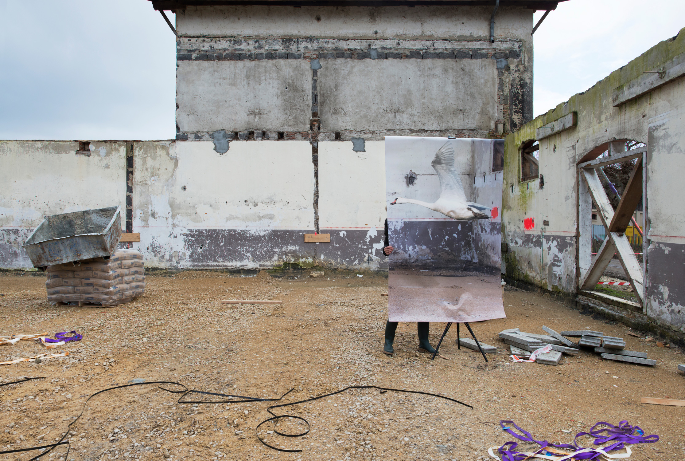 Photography installation produced for the Domaine de Certes, a protected natural area which has been shaped by man for centuries. The photographs were taken on the various building sites of the area, and can been seen by the public during a walk that hides and reveals architecture in the process of being restored. An exhibition organised in partnership with COOP-Bidart and Le Bureau Baroque for Gironde County Council. « Aurore Valade wanders through tales of existence by building « scenes where the human figure and its environment will be at one with each other ». Immersed for a week in this nature reserve, she explored the building site in order to observe its inhabitants. Botanists, grey herons and grasses make up a constantly-shifting, artificial and fragile ecosystem, where equilibriums attempt to adjust . This biodiversity opens up to the artist’s gaze, so that the workings orchestrated by man emerge. The photographer immerses us in strange mise en abymes, through the dialectics of opposites, painting and photography, natural and artificial, animal and human. Even though they appear to be in opposition, these encounters act in synergy, like an ecosystem where the various species, sometimes conflicting, work on finding a balance. In the footsteps of the naturalist, Aurore Valade studies a species and illustrates its role, from swans flying in abandoned buildings to egrets taking off with the help of an ornithologist, she draws up a portrait of an area that has been contributing for decades to the protection of marshy areas and birds, which, if it hadn’t been for man’s investment in them, would have disappeared.»