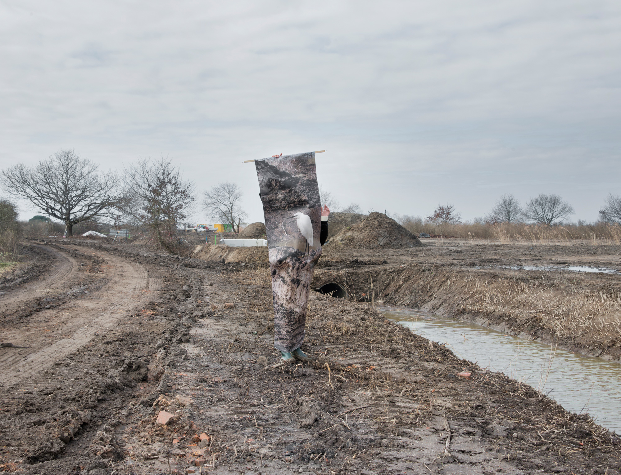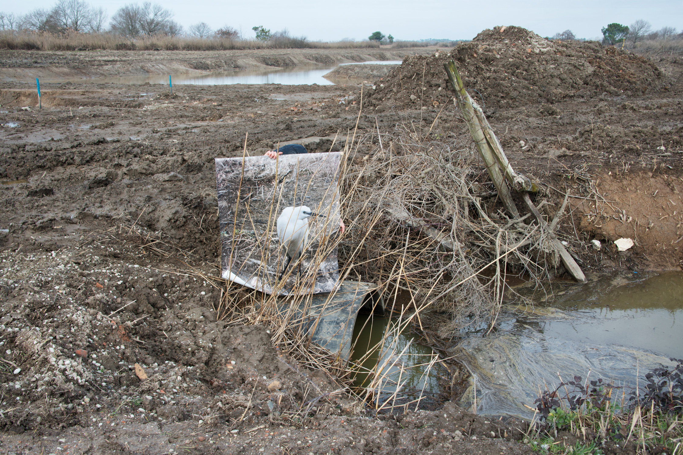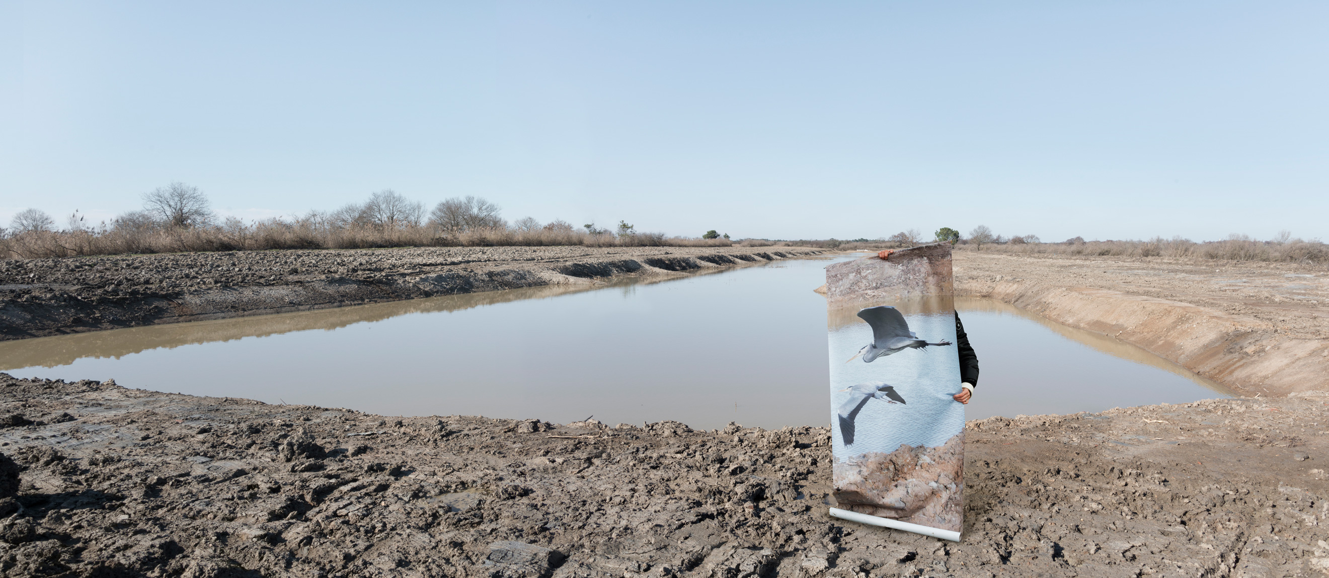 Photography installation produced for the Domaine de Certes, a protected natural area which has been shaped by man for centuries. The photographs were taken on the various building sites of the area, and can been seen by the public during a walk that hides and reveals architecture in the process of being restored. An exhibition organised in partnership with COOP-Bidart and Le Bureau Baroque for Gironde County Council. « Aurore Valade wanders through tales of existence by building « scenes where the human figure and its environment will be at one with each other ». Immersed for a week in this nature reserve, she explored the building site in order to observe its inhabitants. Botanists, grey herons and grasses make up a constantly-shifting, artificial and fragile ecosystem, where equilibriums attempt to adjust . This biodiversity opens up to the artist’s gaze, so that the workings orchestrated by man emerge. The photographer immerses us in strange mise en abymes, through the dialectics of opposites, painting and photography, natural and artificial, animal and human. Even though they appear to be in opposition, these encounters act in synergy, like an ecosystem where the various species, sometimes conflicting, work on finding a balance. In the footsteps of the naturalist, Aurore Valade studies a species and illustrates its role, from swans flying in abandoned buildings to egrets taking off with the help of an ornithologist, she draws up a portrait of an area that has been contributing for decades to the protection of marshy areas and birds, which, if it hadn’t been for man’s investment in them, would have disappeared.»