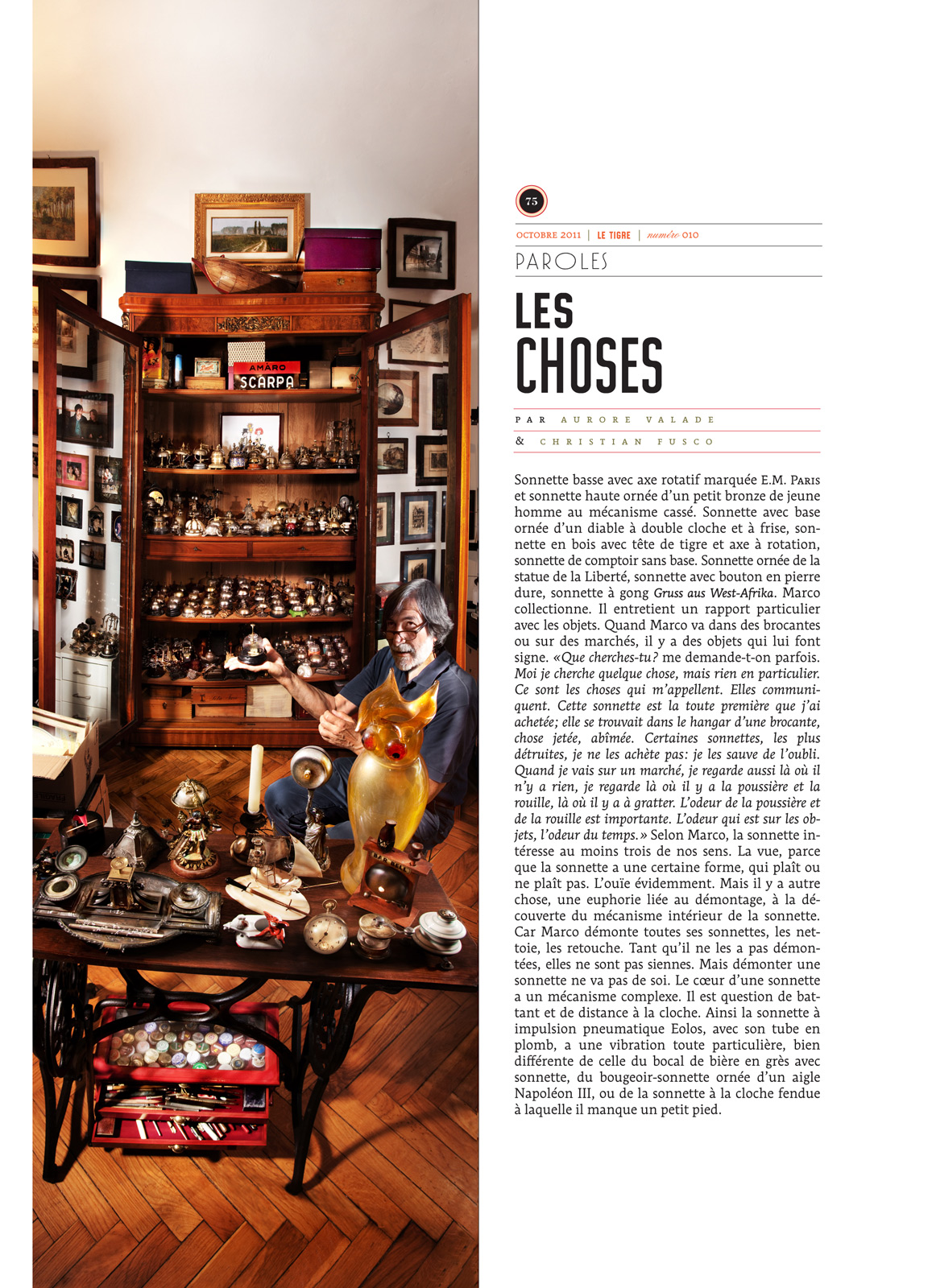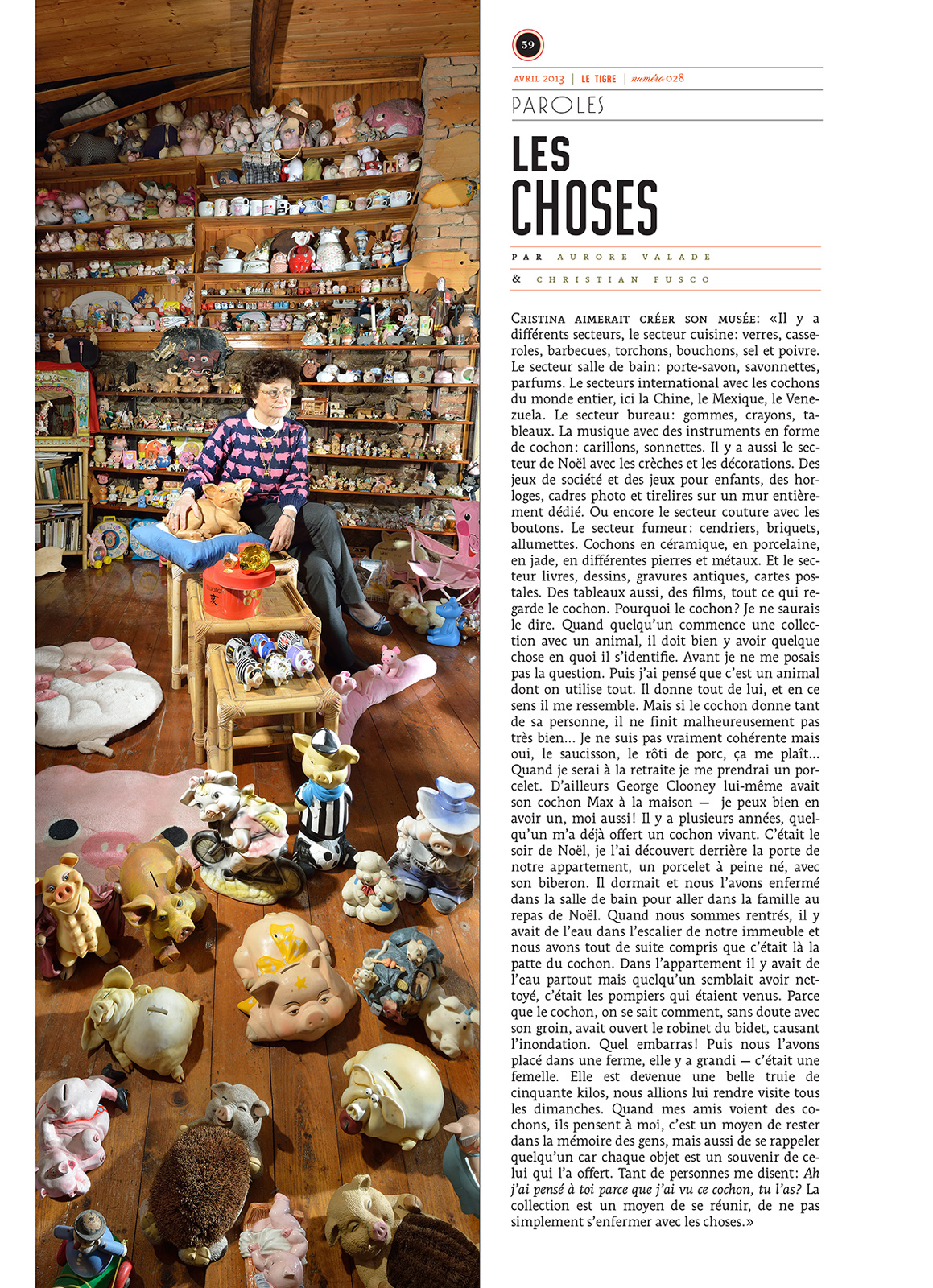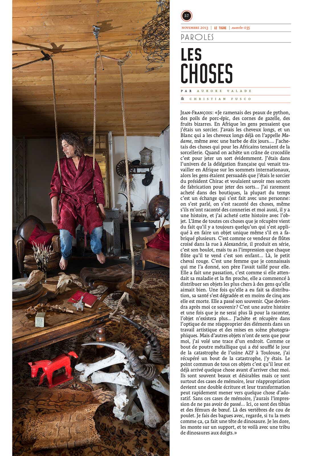 Trente-trois personnes posent, et parlent des objets amassés, entassés, accumulés qui les entourent: cloches, cochons, crucifix, jouets, petites autos, journaux, robes, ordinateurs, bouts de ficelle, pommes, poubelles, cendriers, bouchons de vin, chimères, bateaux, radios, culottes… et autres objets saugrenus, extravagants, insolites — qui sont autant de trésors à leurs yeux.