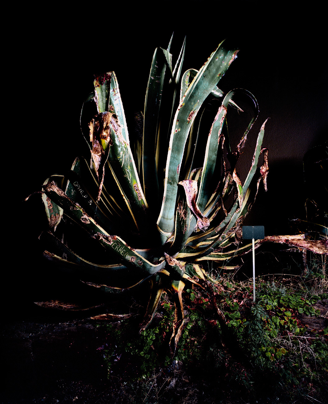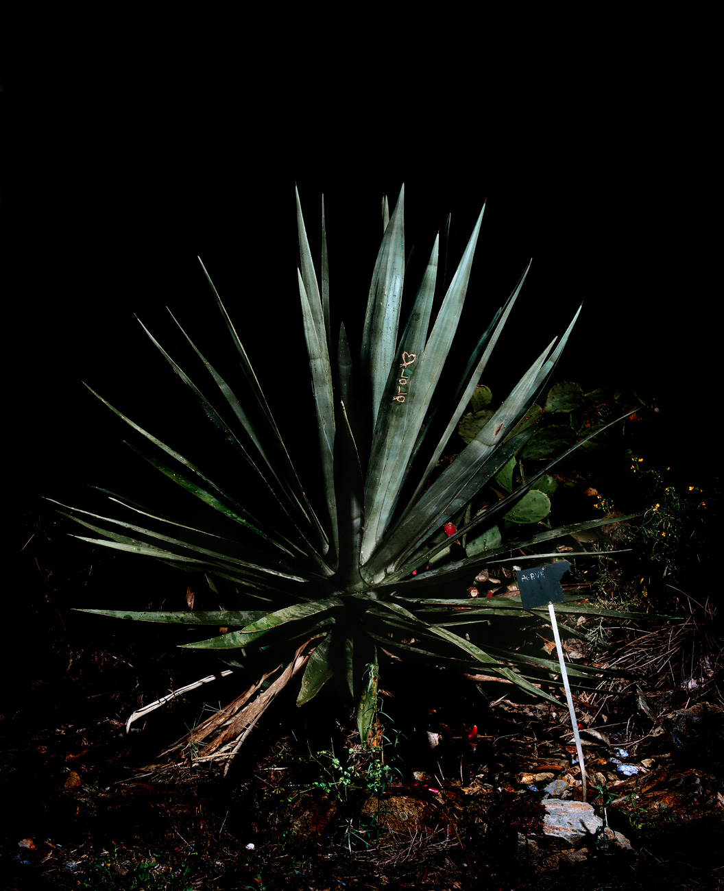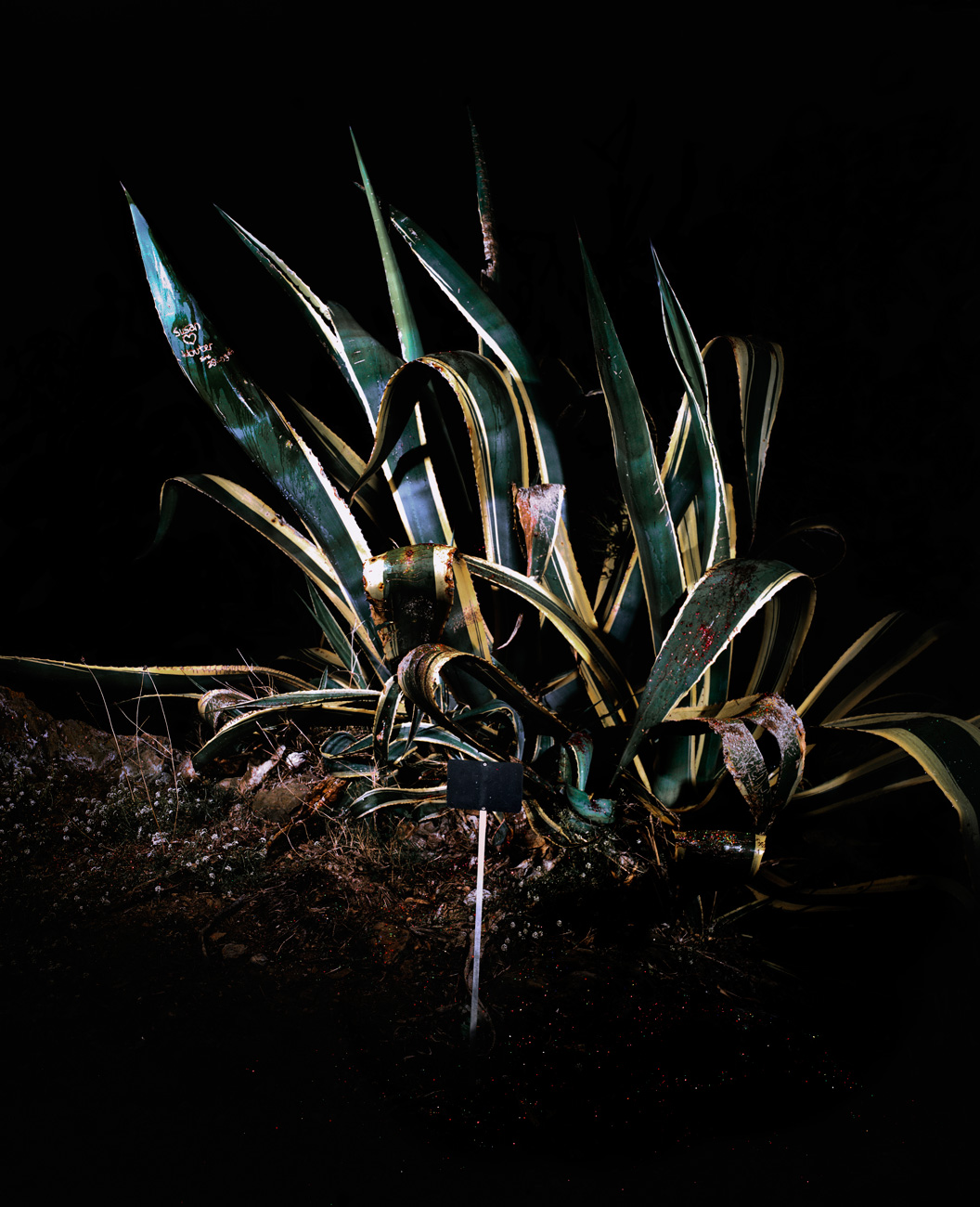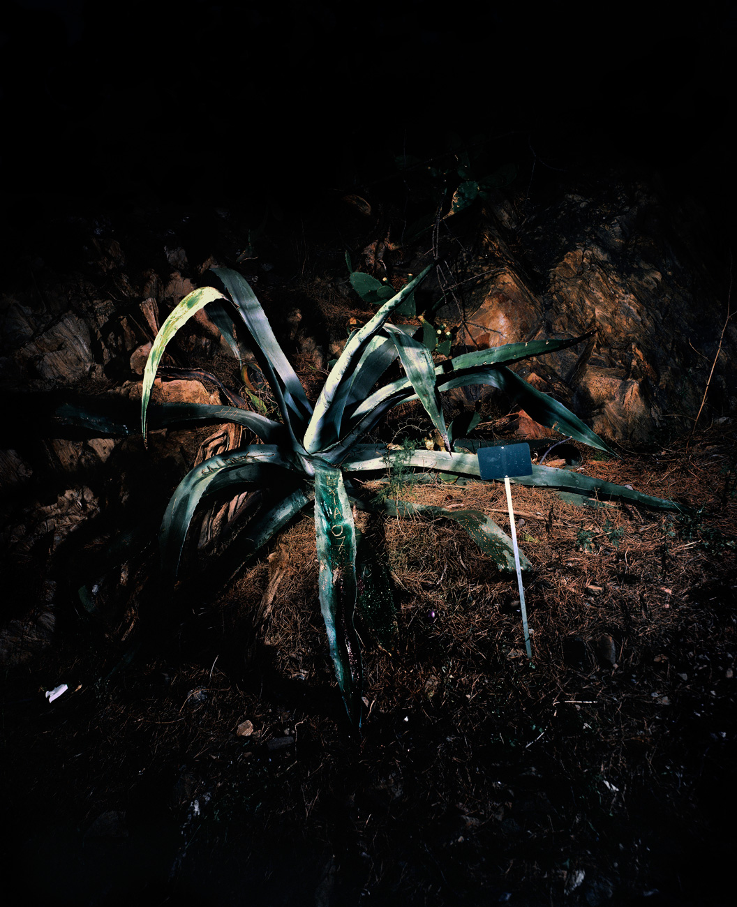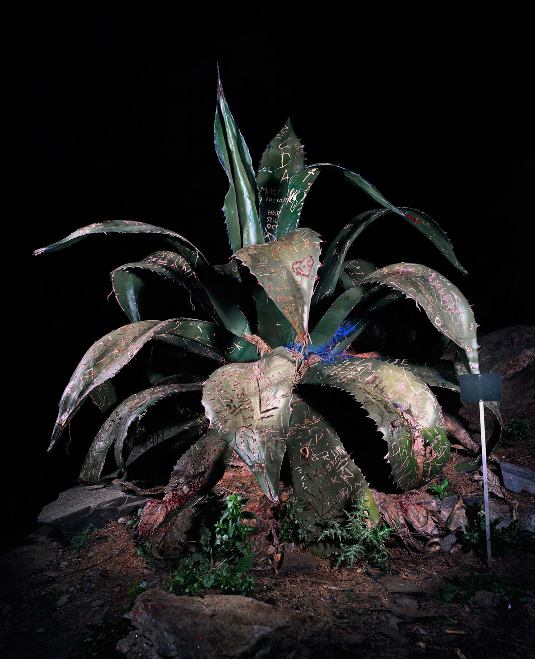 « We might even be startled in the presence of a cactus when looking at this Perec style inventory. Covered with graffitis like an old Pompeii wall, captured with a flash in the night light of a cemetery, these pictures are no lesser portraits than any others. They are not simple images of aloe or agave, they portray ghosts of the present day. At night, graffitis or tags cover every single corner with petitions to their mothers, over-ornate words and embellished signatures. Isolated by the photographic light, these rough bearded plants become more human than the most sensitive human of all. With their prickly artichoke-like leaves, covered with human petitions, these plant dazibaos claim more than a simple artistic status and, for a moment, transform into indistinct portraits of our urban practices.” François Bazzoli, Des éclats d’Aurore, text from the exhibition “Le temps de l’été” Museum of Modern Art in Collioure, 2008.